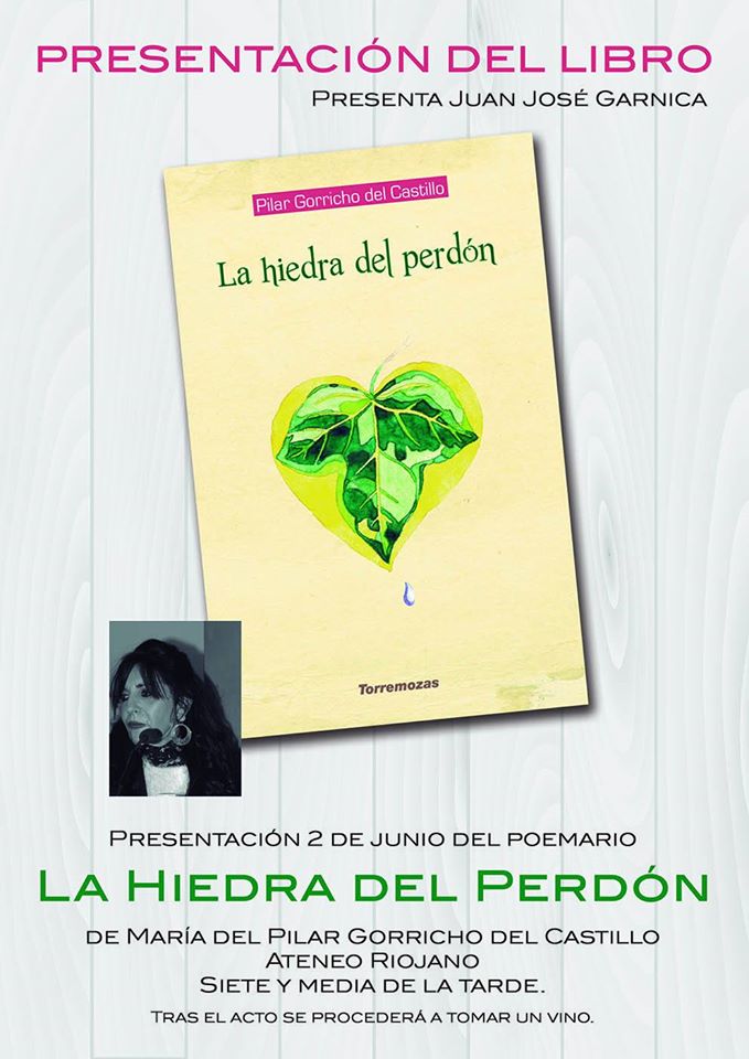 Hace poco se hablo en este medio de «Las flores del Bien», una exposición de Pilar Gorricho y Cecilio Barragán. Y el 2 de Junio Jueves se presentará el último libro de PIlar Gorricho del Castillo. «La hiedra del Perdón», quinto poemario, donde desgrana la culpa y el sentimiento redentor del perdón como única opción para seguir viviendo tras los golpes de la vida.