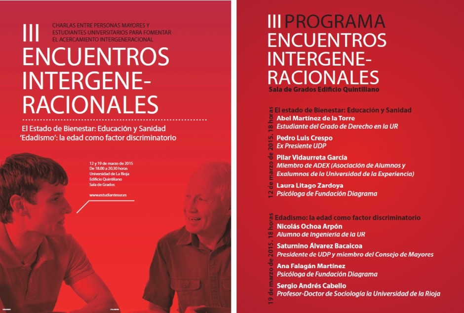 Los III Encuentros Intergeneracionales continúan hoy, jueves 19 de marzo, a las 18.00 horas, en la Sala de Grados del Edificio Quintiliano de la Universidad de La Rioja, con una sesión sobre el Edadismo, es decir, la edad como factor de descriminación.