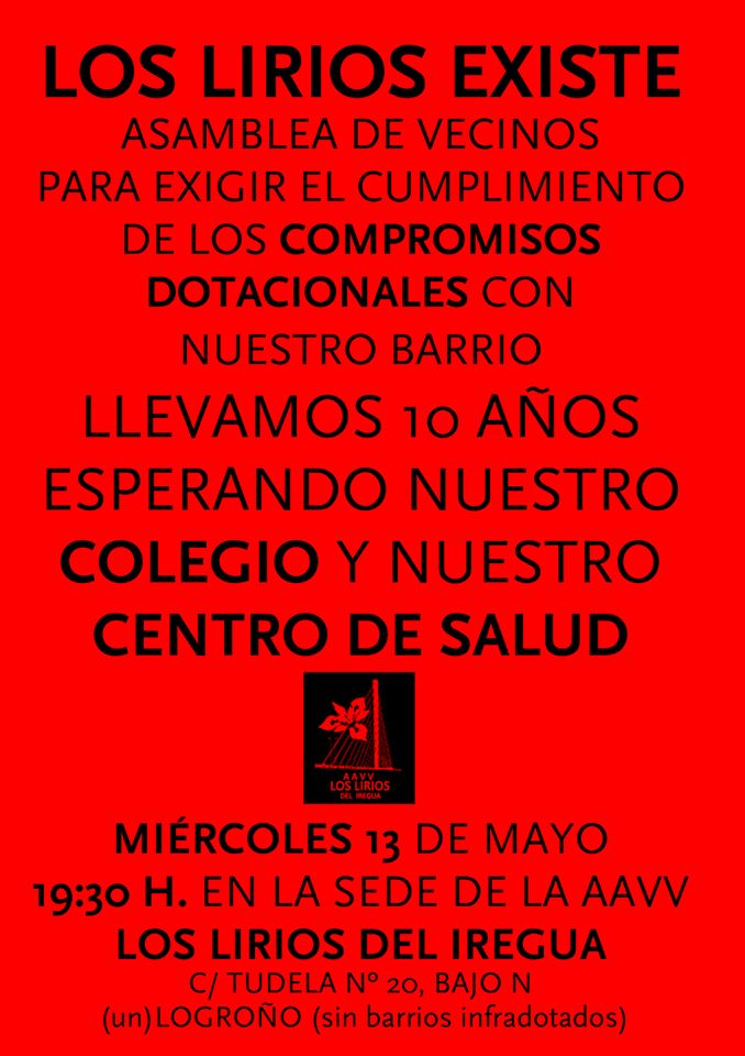 11210484_10153289338958007_4161776637701290374_nLos vecinos del barrio han organizado una Asamblea de Vecinos el día 13 de Mayo, miércoles a las 19:30 en la Sede de la Asociación de Vecinos Los Lirios, para exigir a las administraciones, local y autonómica, que se cumplan en el barrio los compromisos dotacionales que llevan diez años de retraso. En la actualidad es el único barrio de la ciudad que carece de centro de salud (para que puedan ser atendidos los vecinos y pudiera dar así una atención más cercana, además de que, con toda probabilidad, se abriría una famacia que hoy no existe) y un centro educativo para que los niñ@s, 49 de 3 años, que han sido dispersados a diferentes centros, aunque para llegar a ellos haya que cruzar descampados y la circunvalación, a las familias les evitaría un gravamen económico en desplazamientos que vulnera la igualdad entre vecinos de la ciudad. Un barrio con un centro educativo y un centro de salud crea también un barrio más socializado y mád vivo. Cuando los barrios tienen servicios, favorecen la conciliación laboral y familiar, y mejoran el bienestar de las familias.
